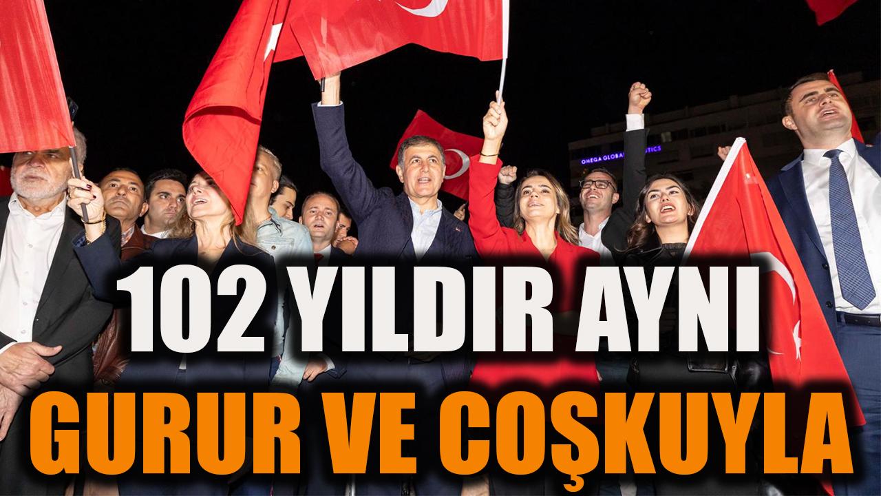 İzmir, 29 Ekim Cumhuriyet Bayramı’nı tüm gün büyük bir katılımla kutladı. Sabahın ilk saatlerinden itibaren 102. yıl heyecanı tüm kenti sardı. 7’den 70’e İzmirli yurttaşlar kutlamalarda bir araya geldi. Akşam saatlerinde ise binlerce İzmirli fener alayında buluştu. İzmirliler saat 20.00'de Hükümet Konağı önünde toplanarak İzmir Büyükşehir Belediyesi Bandosu eşliğinde Alsancak istikametine doğru yürüyüşe geçti. Korteje İzmir Büyükşehir Belediye Başkanı Dr. Cemil Tugay ile eşi Öznur Tugay, İzmir Vali Yardımcısı Erkan Karahan, CHP İzmir İl Başkanı Çağatay Güç, Konak Belediye Başkanı Nilüfer Çınarlı Mutlu, İzmir Büyükşehir Belediyesi Genel Sekreteri Zeki Yıldırım, İzmir Büyükşehir Belediyesi bürokratları, siyasi parti temsilcileri, sivil toplum kuruluşları, dernekler, odaların başkanları ile temsilcileri, meclis üyeleri, muhtarlar ve binlerce yurttaş katıldı.