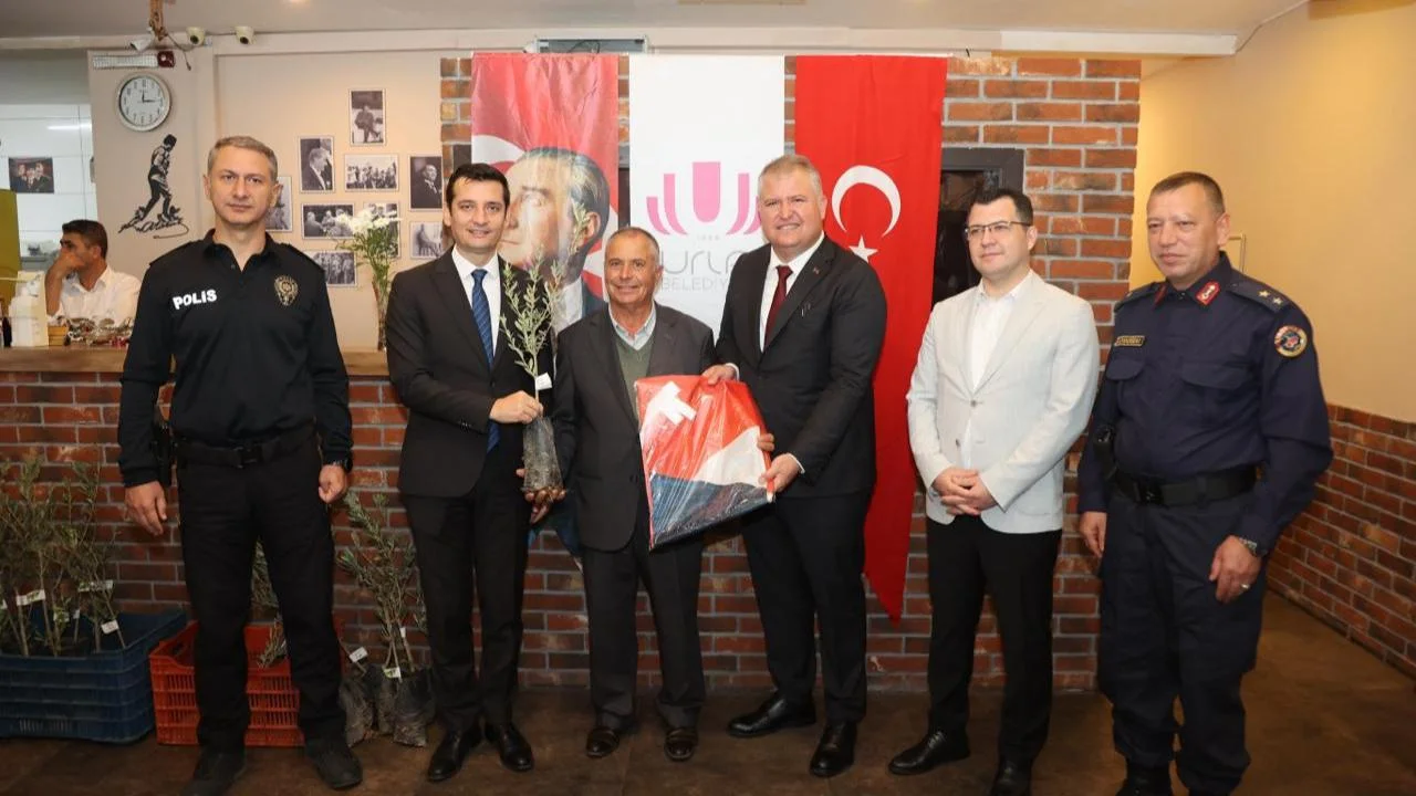 Urla Belediye Başkanı Selçuk Balkan, düzenlenen kahvaltı etkinliğinin ardından muhtarlara Türk Bayrağı ve Zeytin Fidanı hediye etti.
