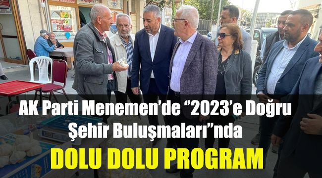 AK Parti Genel Merkez Teşkilat Başkanlığı’nın düzenlediği ‘’2023’e Doğru Şehir Buluşmaları’’ İzmir programı kapsamında AK Parti Manisa Milletvekili İsmail Bilen, Menemen’de ziyaretlerde bulundu. AK Parti Menemen İlçe Başkanı Ahmet Can Çelik, programı değerlendirerek ‘’Gün boyu Milletvekilimiz Sayın İsmail Bilen ve teşkilatımızla STK, esnaf, muhtar, üye ziyaretleri gerçekleştirdik. Dün olduğu gibi bugün de milletimiz ile iç içe olmaya devam ediyoruz, yarında olmaya devam edeceğiz. Biz gücümüzü milletimizden alıyoruz, gördük ki milletimizde 2023’e hazır.’’ dedi.