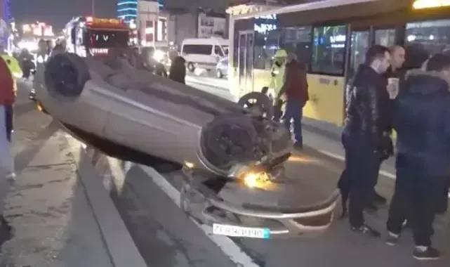 Kaza anı çevredeki bir iş yerinin güvenlik kamerasına yansıdı. Görüntülerde, otomobilin servis minibüsüne çarptıktan sonra refüje çıkarak ters döndüğü ve kıvılcım çıkararak sürüklendiği görüldü.
