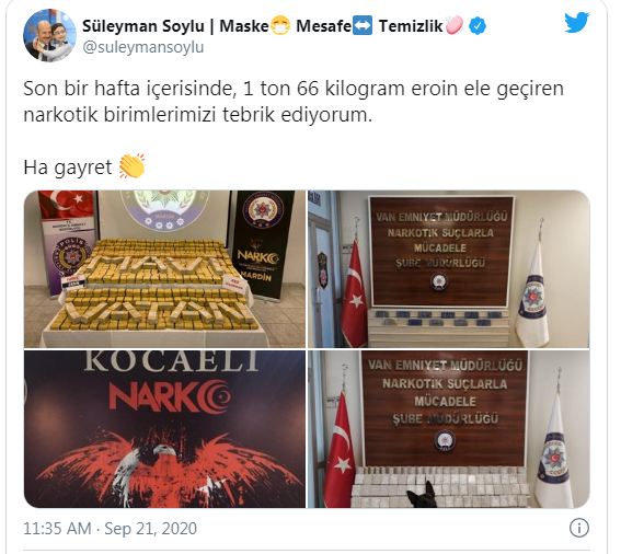 İçişleri Bakanı Süleyman Soylu, "Son bir hafta içerisinde, 1 ton 66 kilogram eroin ele geçiren narkotik birimlerimizi tebrik ediyorum" dedi.