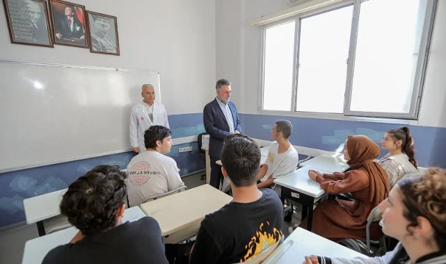 Kurumda sözleşmeli olarak çalışan tüm eğitmenlerin kadroya alınacağını da müjdeleyen Başkan Sandal, sınıfta öğrencilere de ders kitaplarını dağıttı.
