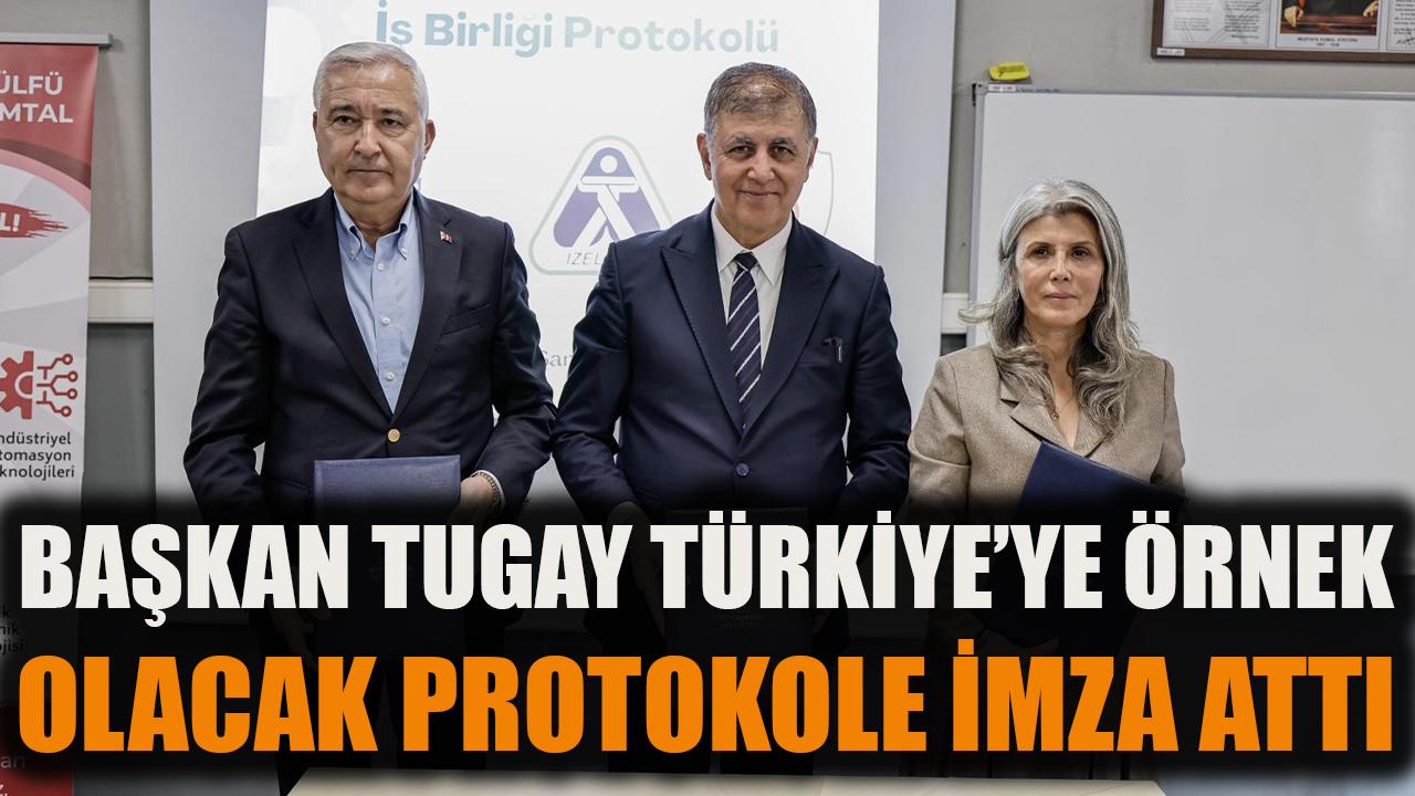 Protokol töreninde konuşan Başkan Cemil Tugay, “Buram buram eğitim ve üretim kokan bir çatının altında olmak özel hissettiriyor. Bu kurumlar, ülkemiz ve toplumumuz için lokomotif yerler, geleceğe dair umudu güçlendiren yerler. Bizler bu hikâyenin bir parçası olmaya çalışıyoruz. Bir taraftan üretime destek olurken, bir taraftan şehrimizde eğitim kalitesini yükseltmeye, çalışma yaşamının daha sağlıklı olması için elimizden gelen desteği vermeye çalışıyoruz. Yerel yönetimler, yasalarla daha çok şehrin altyapısı ve üstyapısı ile ilgili sorumlulukları olan kurumlardır. Ancak çağdaş yerel yönetim anlayışı bunların ötesindedir. Şehrin markalaşmasına, üretim kapasitesinin artmasına destek olmamız gerekiyor. Artık zamanla yerel yönetimlerin böyle kimliklere bürüneceğini görmek lazım. Biz de bunun gereğini yerine getirmeye çalışıyoruz” sözlerine yer verdi.