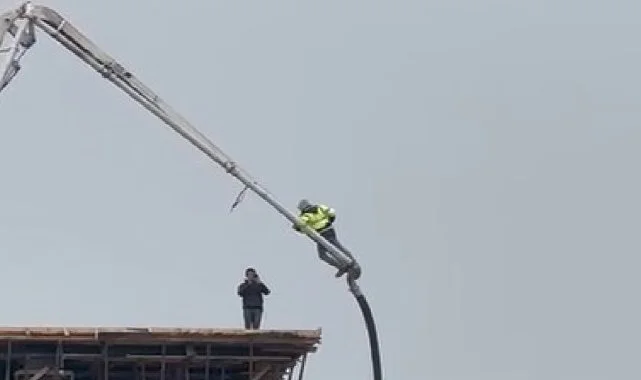 Beton pompasının üstüne uzanıp adeta ölüme meydan okudu