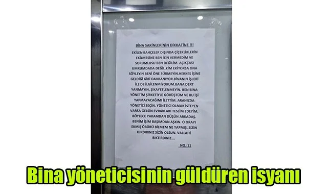 Kayseri'de bir bina yöneticisi, bina sakinlerine isyanını bina içerisindeki cama astığı kağıtla gösterdi. Kağıda yazdıklarıyla adeta içini döken bina yöneticisi, görevini bırakacağını ve artık binanın işleriyle uğraşmaktan sıkıldığını söyledi. Yönetici, güldüren isyanını kağıda döktüğü şu sözlerle ifade etti: Bina sakinlerinin dikkatine. Ekilen bahçeler dışında çiçekliklerin ekilmesine ben izin vermedim ve sorumlusu ben değilim. Açıkçası umrumda da değil. Kim ekiyorsa ona söyleyin beni öne sürmeyin. Herkes işine geldiği gibi davranıyor. Binanın işleri ile de ilgilenmiyorum. bana dert yanmayın, şikayet etmeyin. Ben bina yönetim şirketiyle görüştüm ve bu işi yapmayacağımı ilettim. Aranızda yönetici seçin. Yönetici olmak isteyen varsa gelsin evrakları teslim edeyim. Böylece yakamdan düşün arkadaş. Benim işim başımdan aşkın. O orayı ekmiş öbürü bilmem ne yapmış. Sizin dırdırınız sizin olsun. Vallahi bıktırdınız.”