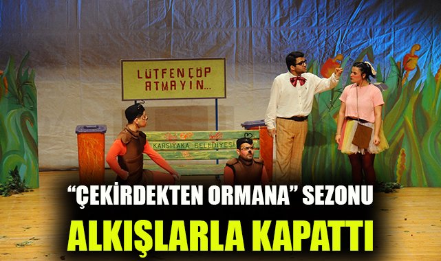 Orkestra Müdürlüğü bünyesinde faaliyetlerini sürdüren Karşıyaka Belediye Tiyatrosu, “Çekirdekten Ormana” oyununu sene başından bu yana toplam 7 kez seyircilerle buluşturdu. Batuhan Üçler’in yazdığı, Mürüvvet Aydın’ın yönettiği ve Belediye Tiyatrosu’ndan yetişen 10 oyuncunun sahnelediği oyun; içeriğinde resim, müzik, hareket ve tiyatroyu birleştiren tüm unsurları barındırmasıyla beğeni topladı. Ayrıca kullanılan kostüm ve dekorun geri dönüşüm malzemelerinden elde edilmesiyle dikkat çeken Çekirdekten Ormana’nın başarısı, kapalı gişe gösterimlerle tescillendi. Ücretsiz olarak sahne taşınan ve çok sevilen oyunun önümüzdeki sezon da devam edeceği belirtildi.
