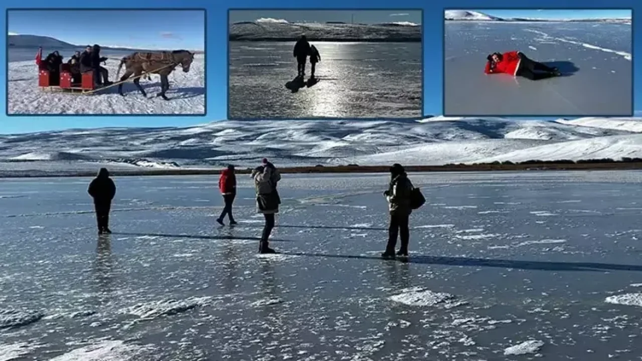 Gölün yaklaşık yüzde 10'luk bölümünü oluşturan buzla kaplı alan yerli misafirlerin ilgisini çekti. Bölgeye gelen misafirler, buz kalınlığının 10 santimetreye ulaştığı göl yüzeyinde hem yürüdü hem de bol bol fotoğraf çekildi.