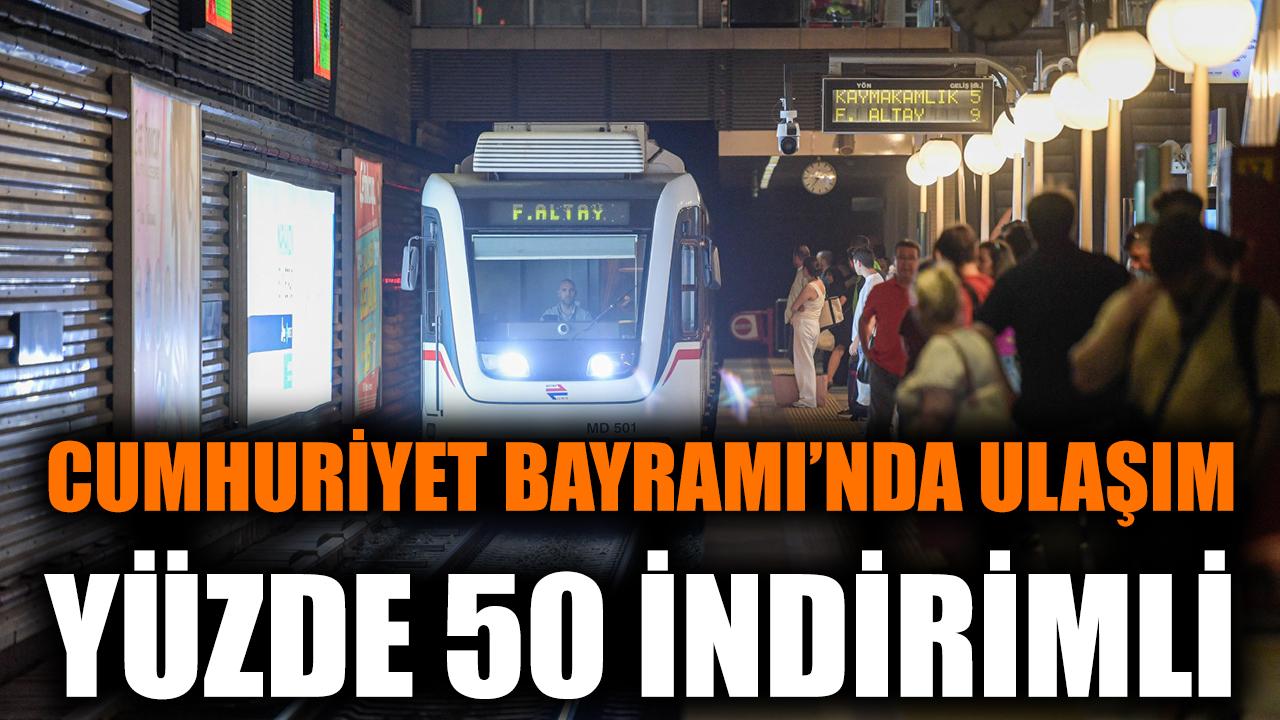 İzmir Büyükşehir Belediyesi’ne bağlı ESHOT, İZULAŞ, İZDENİZ, Metro ve Tramvay işletmeleri, İZTAŞIT araçları 29 Ekim Cumhuriyet Bayramı’nda yüzde 50 indirimli olacak. Büyükşehir-TCDD ortaklığıyla işletilen İZBAN ise gün boyunca ücretsiz hizmet verecek.