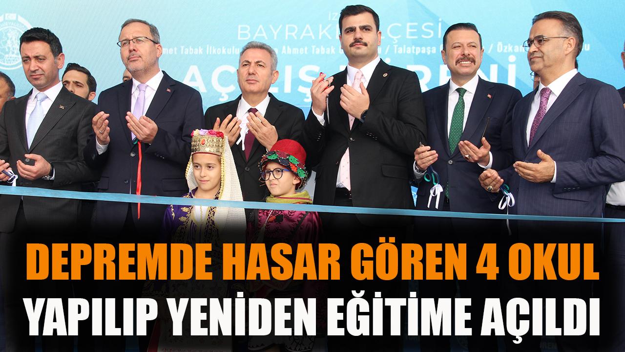 İzmir'in Bayraklı ilçesinde 30 Ekim 2020'de meydana gelen 6,6 büyüklüğündeki depremde zarar gören Sabiha Ahmet Tabak İlkokulu, Sabiha Ahmet Tabak Ortaokulu, Talatpaşa Ortaokulu ve Özkanlar Ortaokulu, Milli Eğitim Bakanlığı tarafından yeniden inşa edildi. Okulların açılış törenine İzmir Valisi Süleyman Elban, önceki dönem Gençlik ve Spor Bakanı ve AK Parti İzmir Milletvekili Mehmet Muharrem Kasapoğlu, AK Parti Genel Sekreteri Eyüp Kadir İnan, AK Parti İzmir Milletvekili Mahmut Atilla Kaya, AK Parti İl Başkan Vekili Mahmut Badem, AK Parti Genel Sekreter Yardımcısı Özgür Hızal, Bayraklı Belediye Başkanı İrfan Önal ile STK ve oda temsilcileri, öğretmenler ve öğrenciler katıldı.