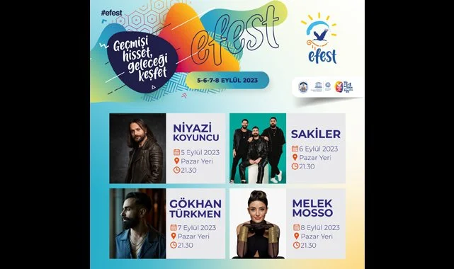 “Geçmişi Hisset, Geleceği Keşfet” sloganıyla düzenlenen EFEST, bu yıl müzik dünyasının önemli isimlerini Efes Selçuk ile buluşturacak. EFEST kapsamında 5 Eylül’de Niyazi Koyuncu, 6 Eylül’de Sakiler, 7 Eylül’de Gökhan Türkmen, 8 Eylül’de Melek Mosso konser verecek. Sevilen sanatçıların konserleri festival süresince saat 21.30’da Pazar Yeri Ana Sahne’de gerçekleşecek.