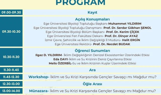 Çalıştay, Ege Üniversitesi Fen Fakültesi Konferans Salonunda 8 Kasım 2024 Cuma günü saat 9.30’da, Ege Üniversitesi Rektörü Prof. Dr. Necdet Budak, Fen Fakültesi Dekanı Prof. Dr. Dinçer Ayaz, İzmir Çevre, Şehircilik ve İklim Değişikliği İl Müdürü Halit Ergin, Biyoloji Bölüm Başkanı Prof. Dr. Kerim Çiçek, Biyoloji Topluluğu Danışmanı Prof. Dr. Serdar Gökhan Şenol ve Biyoloji Topluluğu Başkanı Muhammet Yıldız’ın açılış konuşmaları ile başlayacak.