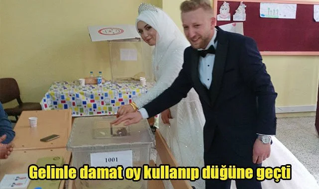Gelinlik ve damat elbisesiyle Cumhuriyet Ortaokuluna gelen çiçeği burnunda çift, evraklarını görevli memura teslim edip 1002 No'lu sandıkta oylarını kullandılar.