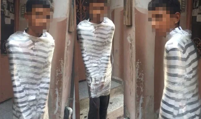 Hırsız kaçmaya çalışınca ise onu ayaktan boynuna kadar streç filmle sardı. Genç hırsıza verdiği akıl almaz cezayı kayda alırken, bir de onu streç kutusuyla darp etti. Yaşananlar kameralara yansırken, gencin polise teslim ettiği hırsız işlemlerinin ardından savcılık talimatıyla kaldığı çocuk yurduna teslim edildi.