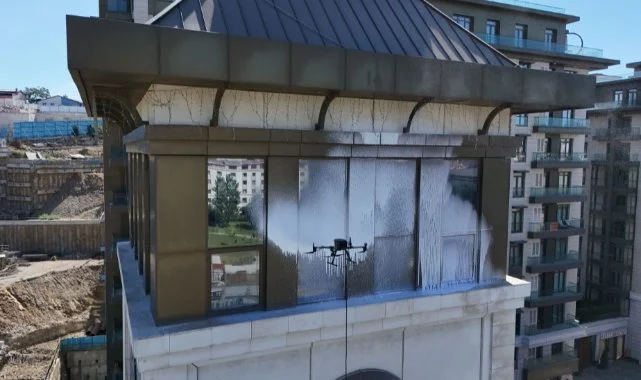 Dünya’da birçok ülkede farklı amaçlarda kullanılan dronlar Türkiye’de bir arge firmasının geliştirdiği proje ile dış cephe temizliği yapıyor. Firma yaz aylarında artan orman yangınlarına hızla müdahale etmek için yangın söndürme projesi üzerinde çalışıyor. Yapılan dış cephe temizliği projesinde dron üzerine entegre edilen bir temizleme başlığı ve hortumu bulunuyor. Hortum yer istasyonuna bağlı bir şekilde dron uçuşunu gerçekleştirebiliyor. Dron öncelikle hazırlanan özel temizleme köpüğünü dış yüzeye uyguluyor. Daha sonra basınçlı su ile köpük uygulanan alan temizleniyor. 15 katlı 2000 metrekare bir bina 1 günde dron ile temizliği yapılıyor. Dağcılar veya vinç yardımı ile bu süre 2-3 güne kadar çıkabiliyor.