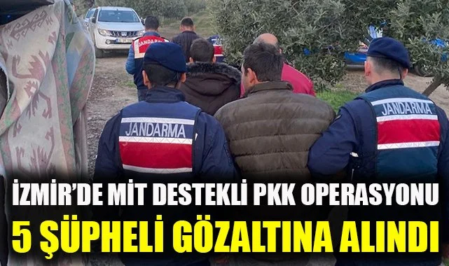 İzmir Cumhuriyet Başsavcılığı tarafından PKK terör örgütüne yönelik yürütülen soruşturma kapsamında, terör örgütüne üye olmak ve sosyal medya üzerinden örgüt propagandası yaptığı tespit edilen 5 Suriye uyruklu şüpheliyi yakalamak için çalışma başlatıldı. Şüphelileri yakalamaya yönelik İzmir İl Jandarma Komutanlığı Terörle Mücadele (TEM) ve İstihbarat Şube Müdürlüğü ekipleri tarafından, Milli İstihbarat Teşkilatı (MİT) destekli operasyon için sabah saatlerinde düğmeye bastı. Sabah 07.15'te il genelinde belirlenen adreslere yönelik gerçekleştirilen şafak operasyonunda, 5 hedef şüpheli kıskıvrak yakalandı.