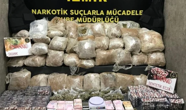 İzmir İl Emniyet Müdürlüğü Narkotik Suçlarla Mücadele Şube Müdürlüğü ekipleri, uyuşturucu sevkiyatı yaptığı belirlenen uyuşturucu tacirlerine yönelik adresleri belirledi. İzmir Cumhuriyet Başsavcılığı koordinesinde harekete geçen Narkotik Suçlarla Mücadele ve İstihbarat Şube Müdürlüğü ekipleri, Konak ilçesinde bulunan iki ayrı adrese baskın gerçekleştirdi. Adreslerde yapılan aramalarda, 35 kilo 67 gram skunk esrar, 15 bin 318 adet sentetik ecza, 2 hassas terazi ve suçtan elde edildiği değerlendirilen 153 bin Türk Lirası nakit para ele geçirildi. Operasyonda K.G., G.S.D., S.G., B.G. ve H.Y. adlı 5 şüpheli gözaltına alındı.