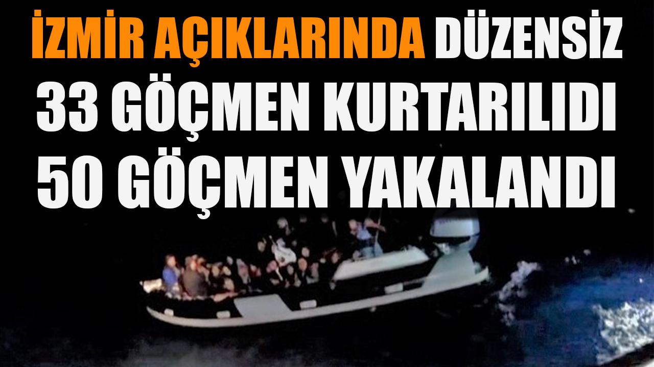 İzmir açıklarında Sahil Güvenlik ekiplerince yapılan iki ayrı operasyonlarda, 33 düzensiz göçmen kurtarılırken, 50 düzensiz göçmen yakalandı.