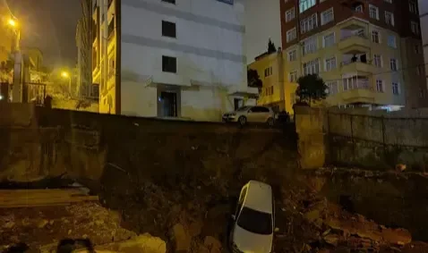 Kartal'da, toprak kayması sonucu park halindeki otomobil inşaat temeli için açılan çukura düştü. Sokakta bulunan 8 katlı bir bina tedbir amacıyla tahliye edildi.