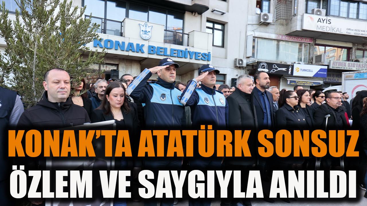 Konak Belediyesi personeli, Ulu Önder Mustafa Kemal Atatürk’ün sonsuzluğa uğurlanışının 87’nci yıl dönümünde, saat 9’u 5 geçe, belediye hizmet binası önünde saygı duruşu gerçekleştirdi. Başta Basmane’deki ana hizmet binası olmak üzere, kentin farklı noktalarındaki hizmet birimleri, Ulu Önder’i anmak için bina önlerinde bir araya geldi. Basmane hizmet binasına asılan dev Atatürk posteri altında toplanan belediye çalışanları, saat tam 9’u 5 geçe, Atatürk için saygı duruşunda bulundu. Türk bayrakları ve Atatürk posterlerinin dalgalandığı Dokuz Eylül Meydanı’na çıkan tüm caddelerde trafik durdu, sürücüler araçlarından çıkarak ve kornalarına basarak sirenlere eşlik etti. Tam bir dakika boyunca hayat dururken, gözlerden akan yaşlar ise durmadı. Saygı duruşunun ardından Konak Belediyesi önünde helva ikramı yapılırken, Atatürk’ün sevdiği şarkılardan oluşan bir seçki de ikram boyunca yoldan geçenlere duygulu anlar yaşattı.