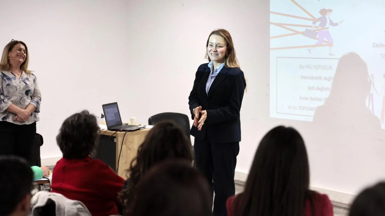 Konak Belediye Başkanı Nilüfer Çınarlı Mutlu, eşitlik ilkesini tüm hizmet alanlarına yaymak amacıyla bu yıl içerisinde yürürlüğe girmesi hedeflenen Yerel Eşitlik Eylem Planı (YEEP) kapsamında düzenlenen İç Paydaş Toplantısı’na katıldı. Türkan Saylan Kültür Merkezi’nde gerçekleşen toplantıya Başkan Mutlu’nun yanı sıra hazırlık sürecinin teknik altyapısını güçlendirmek amacıyla oluşturulan Danışma Kurulu’nun üyelerinden Cinsiyet Eşitliği İzleme Derneği (CEİD) İzmir Koordinatörü Ayla Çelik, TMMOB Kadın Çalışma Grubu Temsilcisi Gülefer Mete, İzmir Tabip Odası Temsilcisi Gülden Aykanat ve Avukat Özlem Durmaz ile birim müdürleri ve her müdürlükten birer temsilci katıldı. Toplantıda toplumsal cinsiyet eşitliği, ayrımcılık, yerel yönetimlerin bu alandaki sorumlulukları ve YEEP’in taşıdığı kritik öneme ilişkin kapsamlı bir sunum yapan Avukat Özlem Durmaz, Başkan Nilüfer Çınarlı Mutlu’ya göreve geldiği günden bu yana eşitlik alanında ortaya koyduğu örnek çalışmalardan dolayı teşekkür etti.