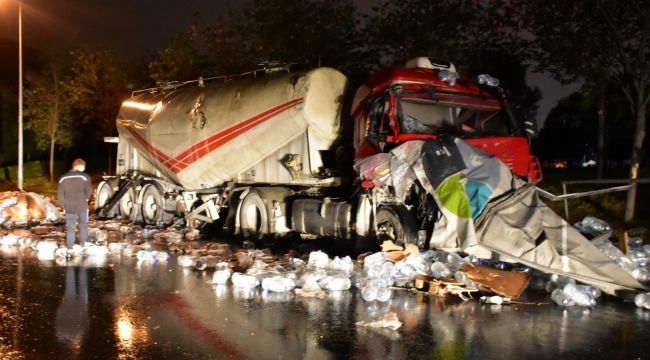 İzmir'de, olumsuz hava şartları nedeniyle kontrolden çıkan bir TIR, park halindeki beton mikserine çarptı. Kazada, TIR sürücüsü yaralanmazken, TIR'daki litrelik su şişeleri yola saçıldı.