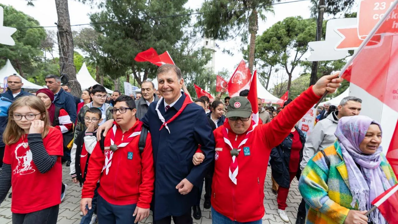 İzmir’de 23 Nisan Ulusal Egemenlik ve Çocuk Bayramı sabahın ilk saatlerinden itibaren coşkuyla kutlanıyor. İzmir Büyükşehir Belediyesi tarafından kentin dört bir yanında düzenlenen etkinlikler, Kültürpark’ta gerçekleştirilen programla taçlandı. Kültürpark’taki kutlamalar, İzmir Büyükşehir Belediye Başkanı Dr. Cemil Tugay’ın katıldığı kortej yürüyüşü ile başladı. Kaskatlı Havuz’dan bando eşliğinde etkinlik alanına kadar süren korteje çocuklar ve aileleri, ellerindeki Türk bayraklarıyla eşlik etti. Başkan Tugay, etkinlik alanına Melek İzciler adlı izci grubundan otizmli Ömercan Anamer ve Osman Türkekul ile birlikte girdi. Çocukların yoğun ilgisiyle karşılanan Tugay, kurulan stantları gezerek çocuklarla sık sık fotoğraf çektirdi.