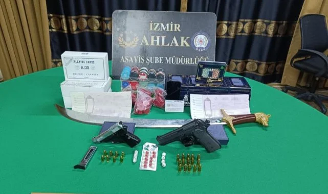 İzmir Asayiş Şube Müdürlüğü Ahlak Büro Amirliği ekipleri, Karabağlar ilçesi Selvili Mahallesi'nde bulunan ruhsatsız iş yerinde kumar oynandığı ihbarı üzerine harekete geçti. Ekipler tarafından adrese yapılan operasyon kapsamında adreste arama yapıldı. Gerçekleştirilen aramada, 2 adet ruhsatsız tabanca ve tabancalara ait toplam 24 adet farklı ölçülerde fişek, 80 santim uzunluğuna sahip kılıç, 10 adet yeşil reçeteye tabi sentetik hap, 2 farklı şahıs adına düzenlenmiş 920 bin TL bedelli borç senedi, 580 adet para yerine geçen çip, 40 kutu iskambil oyun kağıdı, 8 adet özel yapım barbut zarı ele geçirildi.