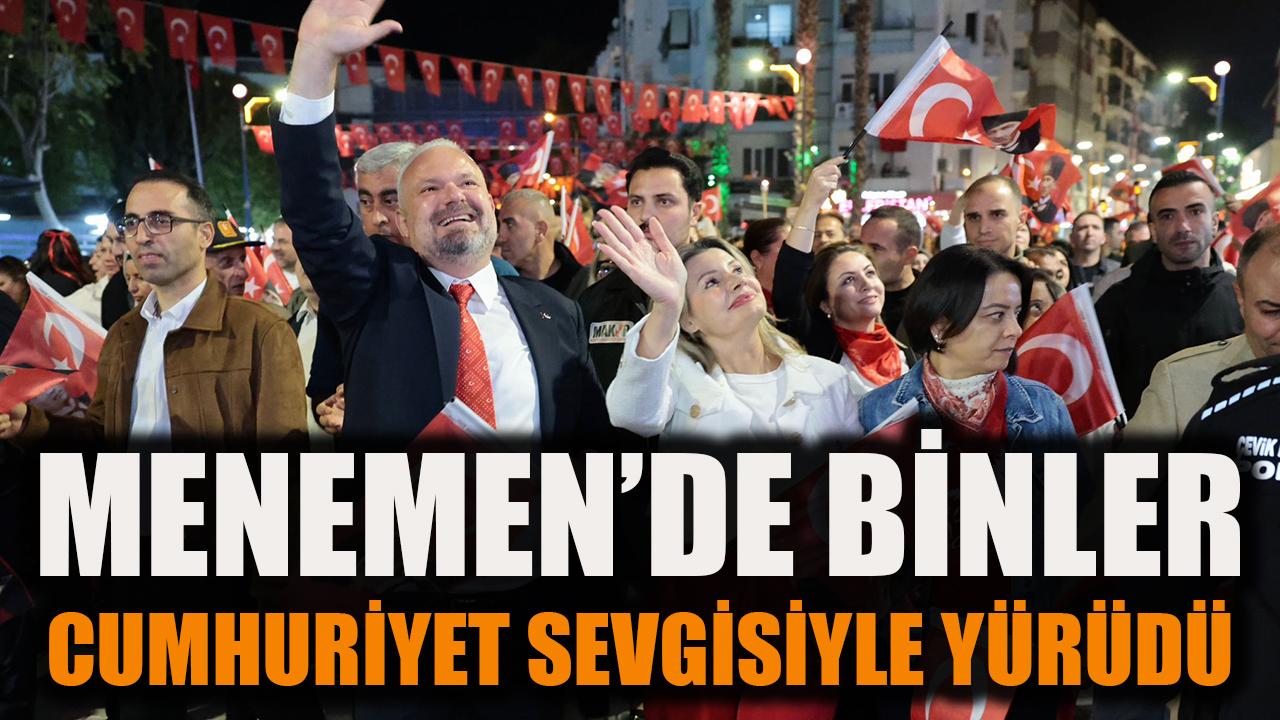 Menemen Stadı önünden başlayan ve Lise Yolu boyunca devam eden, Halil Alkaya Pazar Yeri'nin önünden geçerek Cumhuriyet Meydanı'na varılan yürüyüşün sonunda vatandaşlar Cumhuriyet marşlarıyla karşılandı. Hep birlikte marşların söylendiği ve Atatürk ile Kurtuluş Savaşı'ndan görüntülerin izlendiği gecenin finalinde Menemen Belediye Başkanı Aydın Pehlivan vatandaşlara seslendi.