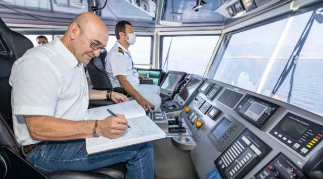 kaptan köşküne çıkarak kaptan Emrah Yener'den bilgi alan Başkan Soyer, seyir