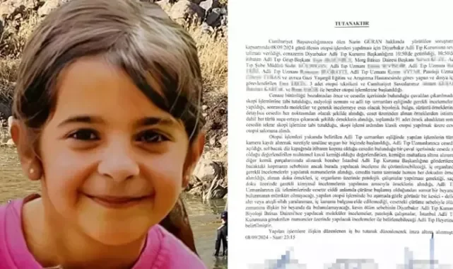 Bağlar ilçesinde 21 Ağustos'ta kaybolan ve 19 gün sonra derede çuval içinde cansız bedeni bulunan Narin Güran’ın Diyarbakır Adli Tıp Kurumu’nda yapılan otopsisinin ön raporu ortaya çıktı. Raporda Narin’in içinde olduğu çuvalda cesede ait olduğu değerlendirilen kaval kemiği bulunduğu, cansız bedeninden 91 örnek alındığı, çürüme başladığı gerekesiyle ölüm şekli ve zamanının belirlenemediği belirtildi. Kesin ölüm sebebinin Diyarbakır Adli Tıp Kurumu Biyoloji İhtisas Dairesi'nce yapılacak çalışmayla belirleneceği belirtilen raporda, şöyle denildi: