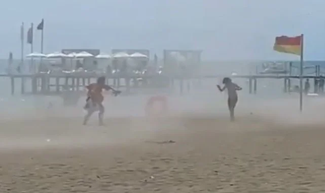 Antalya’nın Serik ilçesinde şiddetli rüzgarın oluşturduğu küçük çaplı hortum, tatilcilere zor anlar yaşattı. Sahilde kum fırtınasına neden olan hortum, şezlongları ve şemsiyeleri de savurdu