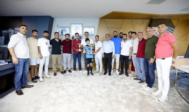 İzmir Amatör Spor Kulüpleri 1. Amatör Lig 4. grubu bu yıl şampiyon tamamlayan Nafiz Gürman Spor Kulübü Futbol Takımı’nın Başkanı Osman Harman, Teknik Direktör Cihan Demir, futbolcular ve teknik ekip Bayraklı Belediye Başkanı Serdar Sandal’ı ziyaret etti. Şampiyonluk kupasını Başkan Sandal’a getirerek takıma ve amatör spor kulüplerine desteklerinden dolayı teşekkür eden sporcular, yeni sezonda da başarı sözü verdi. Kulüp Başkanı Harman, “Bayraklı’yı Süper Amatör Lig’de en iyi şekilde temsil edeceğiz. Bayraklı’nın bu ligdeki tek takımı olmanın gururunu yaşıyoruz. Desteklerinizden dolayı size ve emeği geçen herkese teşekkür ediyoruz. Yeni sezonda da hedefimiz yine kupa olacak” dedi.