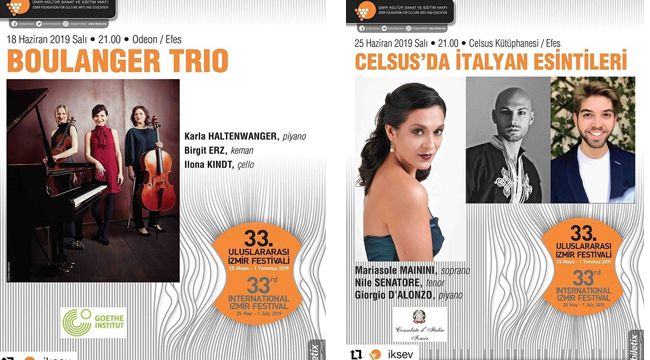 Kültür ve Sanatın buluştuğu Kent Selçuk Efes'te 18 Haziran Salı günü saat 21.00’de Efes Odeon’da günümüz oda müziği topluluklarından Boulonger Trio, romantik döneme ait eserlerinin yanı sıra çağdaş müzik yapıtlarından da oluşan repertuarları ile sanatseverlerin karşısına çıkacak. 25 Haziran Salı günü ise eşsiz tarihi dokusuyla ünlü Efes Celsus Kütüphanesi’nde İtalyan Ezgileri yankılanacak. Dünyaca ünlü sanatçı Maria MAININI (Saprano), NileSenatore (Tenor) ve Giorgio D’ALANZO (Piyanist) sanatseverlere muhteşem bir müzik ziyafeti sunacak.