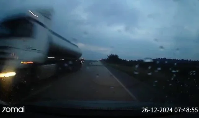 Olay, Dörtyol ilçesi E-5 karayolunda Yeniyurt Mahallesi mevkiinde yaşandı. Yağışlı havanın etkisiyle sürücüsünün direksiyon hakimiyetini kaybettiği tanker karşı şeride geçti. Herhangi bir kazanın yaşanmadığı korku dolu anlar karşı şeritte ilerleyen bir aracın kamerasına yansıdı.