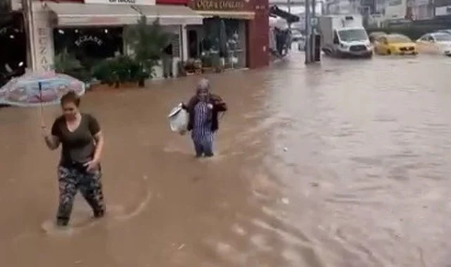 İzmir’in Çiğli ilçesinde, etkili olan sağanak yağış caddeleri sular altında bırakırken, bazı iş yerlerini su bastı, vatandaşlar dizine kadar sularda yürümek zorunda kaldı.