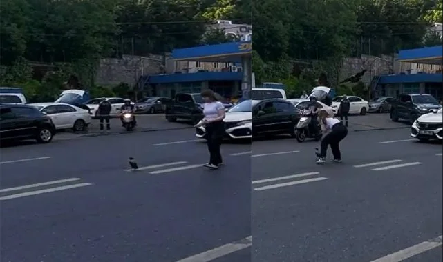 Beşiktaş’ta yolun ortası düşen yavru kargayı gören bir kadın sürücü, aracından inerek yardıma koştu. Yavru kargayı eline almak isterken başka bir karganın saldırısına uğrayan kadın sürücü, koşarak aracına bindi. O anlar ise cep telefonu kamerasına yansıdı