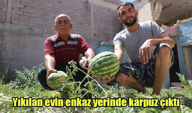 Madenboyu Mahallesi’nde yaşayan Nazmi Yamaner’in yıkılan evinin enkazının kaldırılmasının ardından arazide 4 adet karpuz çıktı. Karpuzlara özenle bakan Yamaner, 2 karpuzu çocukların kopardığını, geriye kalan diğer 2 karpuzuysa yiyeceklerini söyledi.
