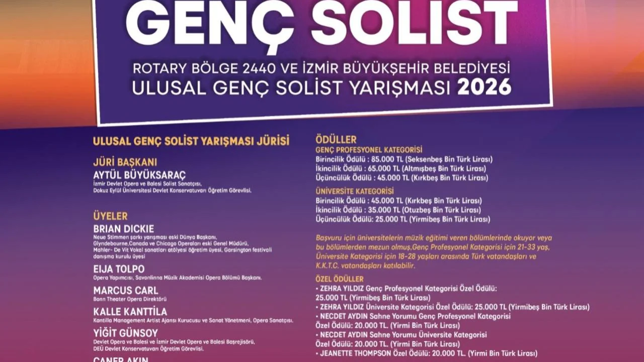 İzmir Büyükşehir Belediyesi, Rotary Bölge 2440 ve Dokuz Eylül Üniversitesi Devlet Konservatuvarı iş birliğiyle düzenlenen Ulusal Genç Solist Yarışması 2026, 6-9 Şubat tarihleri arasında yapılacak. Yarışmanın jüri başkanlığını İzmir Devlet Opera ve Balesi Solist Sanatçısı ve Dokuz Eylül Üniversitesi Devlet Konservatuvarı Öğretim Görevlisi Aytül Büyüksaraç üstleniyor. Yarışma, iki ayrı kategoride final konserleriyle sanatseverlerle buluşacak. Üniversite Kategorisi Finali, 9 Şubat Pazartesi saat 15.00’te Küçük Salon’da, Genç Profesyonel Kategorisi Final Konseri ve Ödül Töreni ise aynı gün saat 20.00’de Büyük Salon’da halka açık olarak gerçekleştirilecek.
